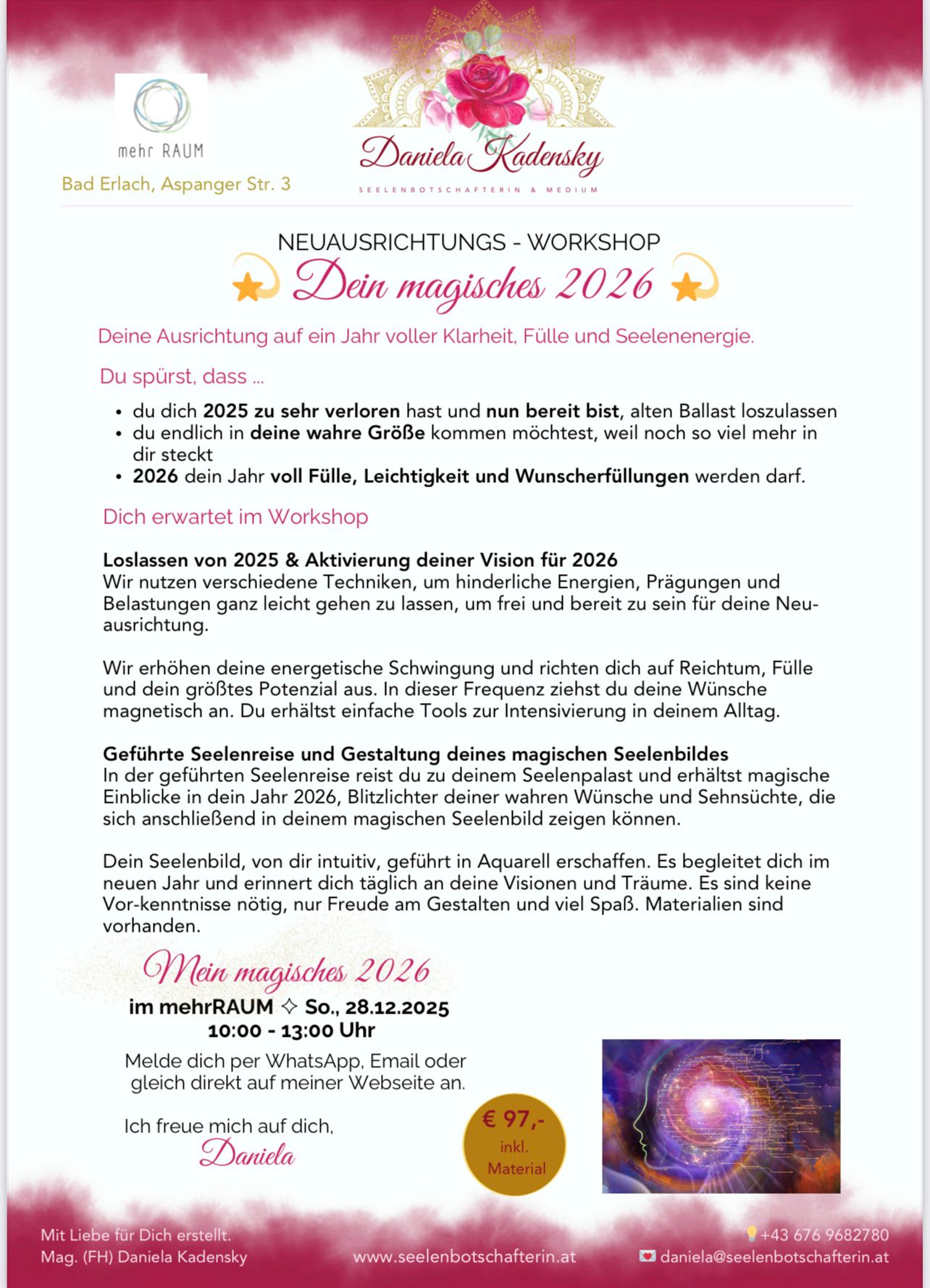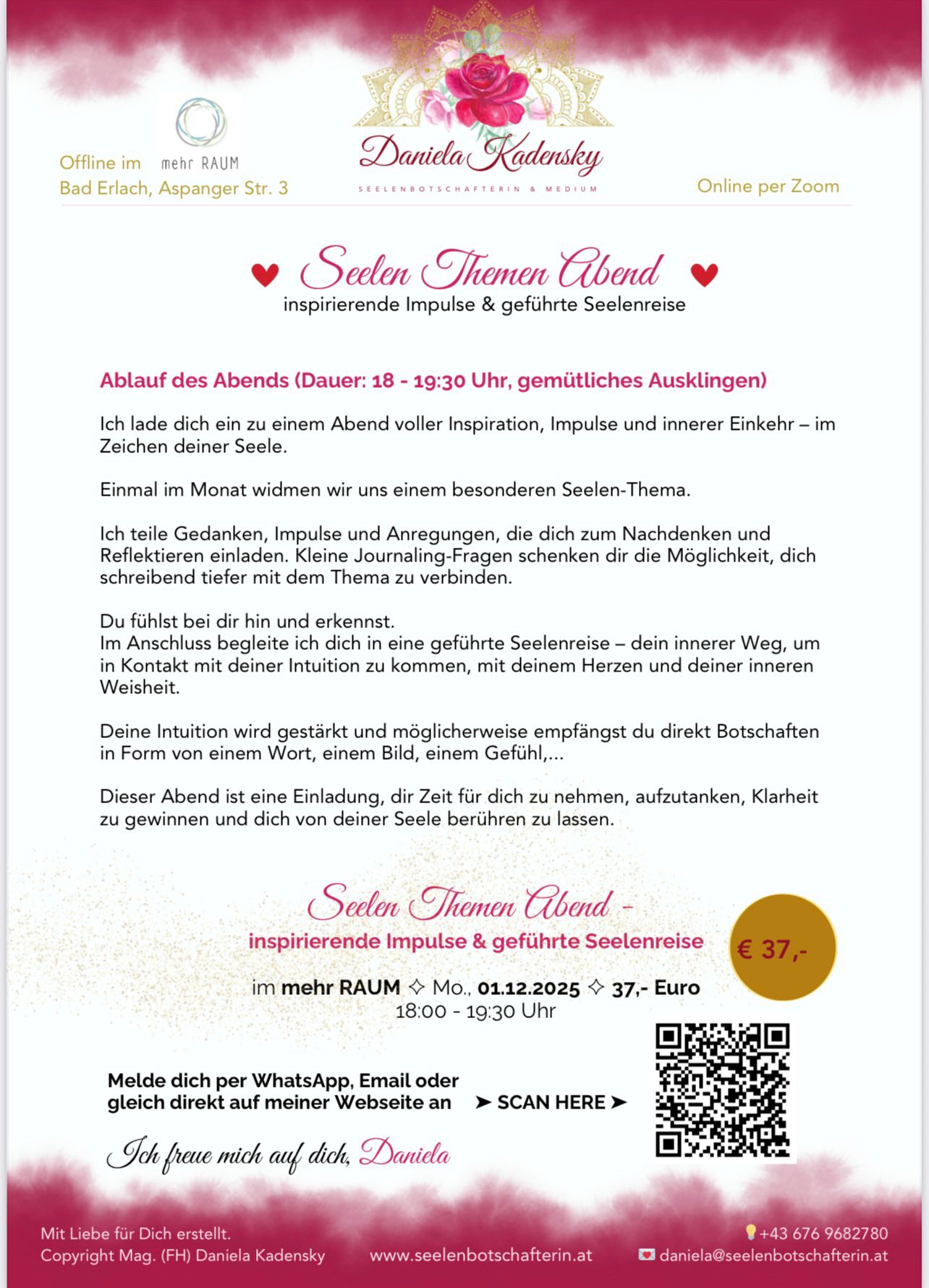 18:00 - 19:30 Seelen Themen Abend – inspirierende Impulse & geführte Seelenreise 1 Dezember @ 18:00 - 19:30 Seelen Themen Abend – inspirierende Impulse & geführte Seelenreise 1. Stock / TOP 3